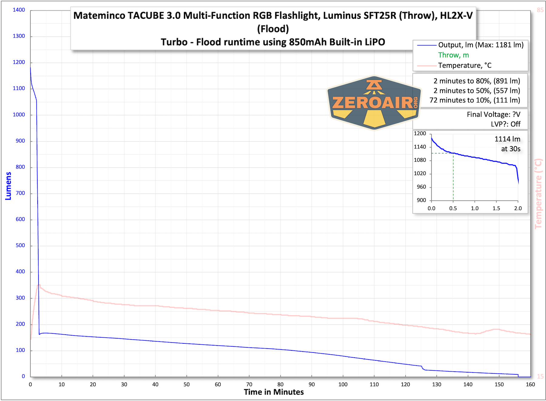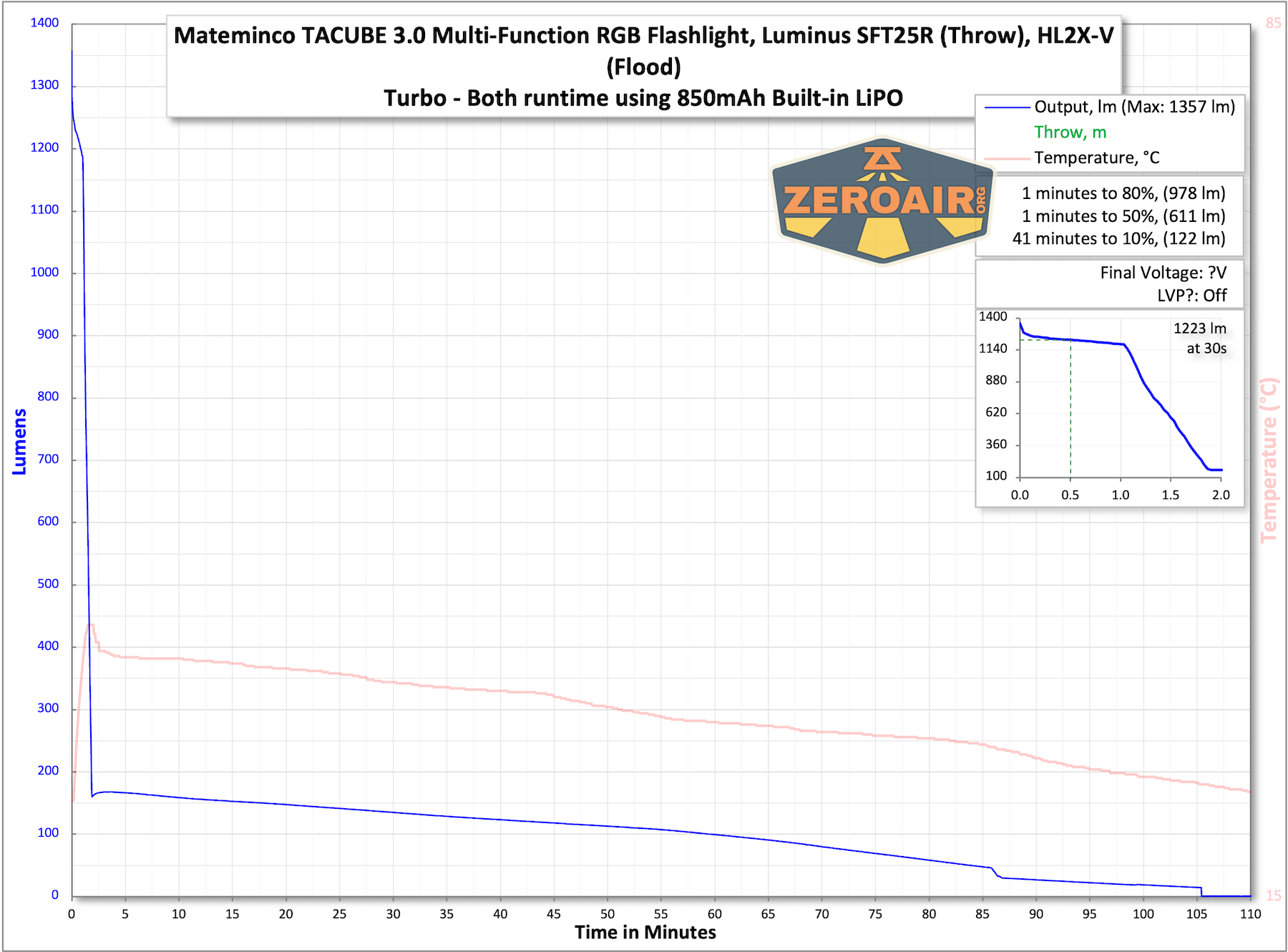 | Measured Lumens (at 30s) | Both: 1223 (78.9% of claim)^ Flood: 1114 (111.4% of claim)^ Throw: 610 (93.8% of claim)^ |