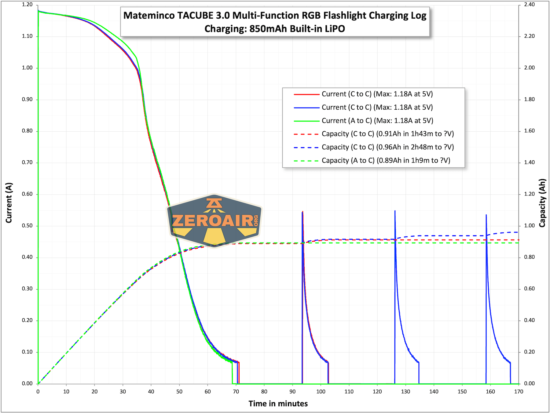 Charging works fine and takes around an hour to complete. But if you leave the light on the charger, you’ll continue to get these brief charge spikes for hours and hours (essentially as long as I tested – well past what’s shown in the graph below).