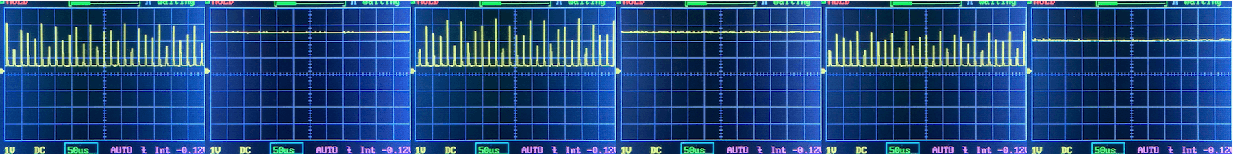 Then there’s the Ultrafire WF-602C flashlight, which has some of the worst PWM I’ve seen. It’s so bad that I used a post about it to explain PWM! Here are multiple timescales (10ms, 5ms, 2ms, 1ms, 0.5ms, 0.2ms) to make comparing this “worst” PWM light to the test light easier. That post also explains why I didn’t test the WF-602C at the usual 50us scale.