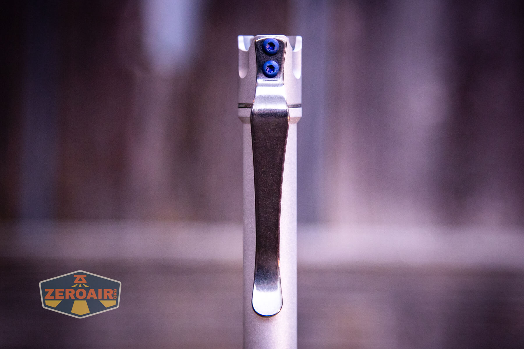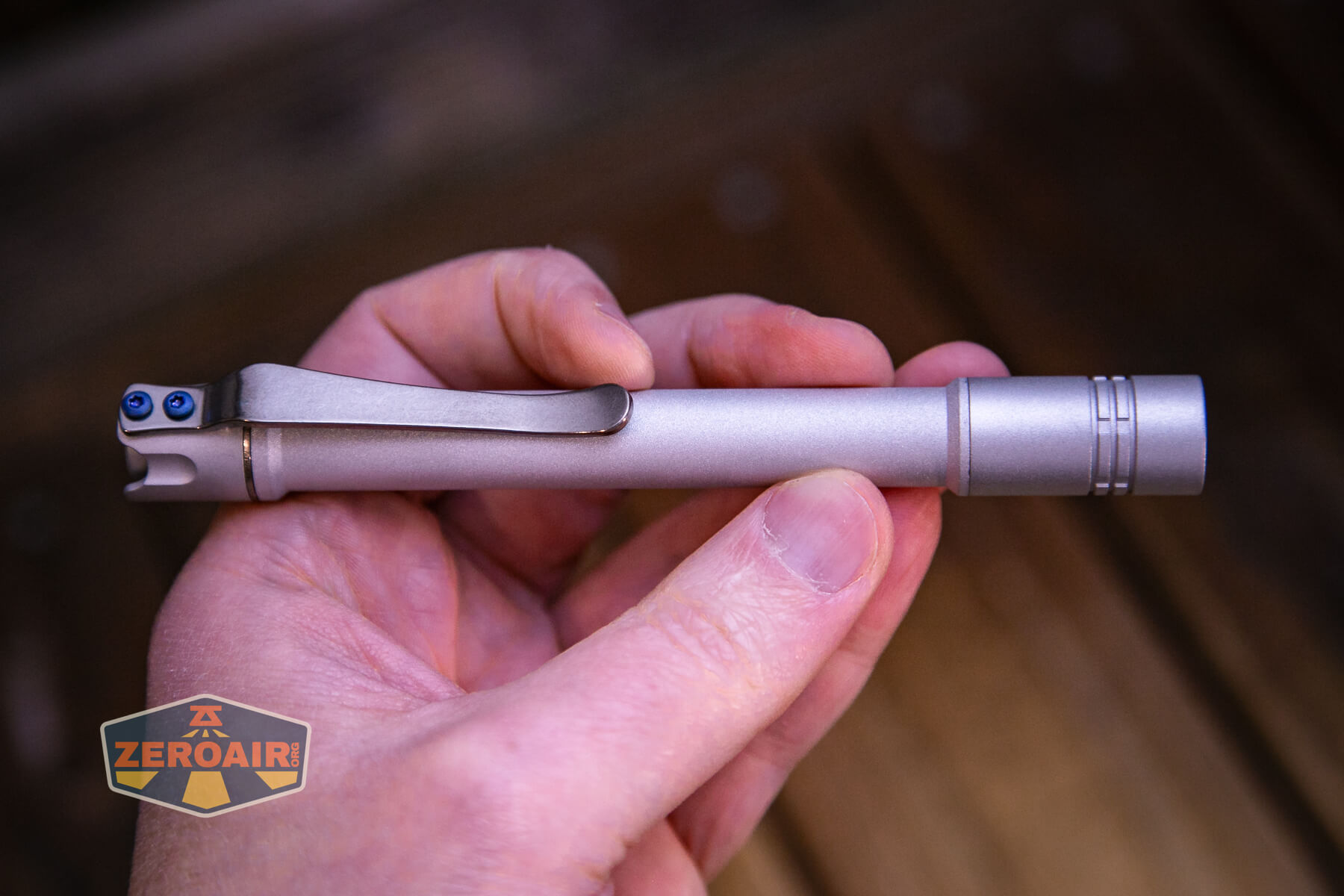 The ReyLight Penlight MkII Aluminum flashlight in titanium ships with a two-screw clip installed.