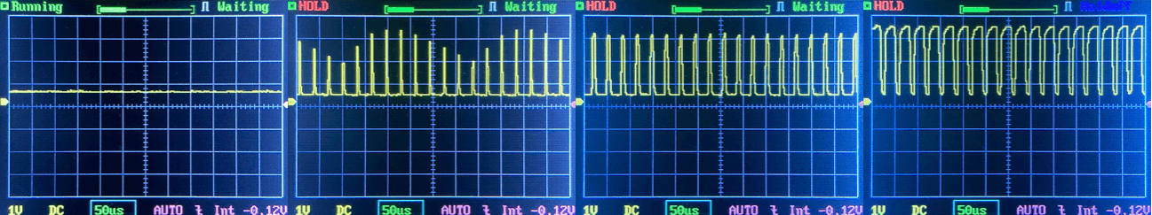 Then there’s the Ultrafire WF-602C flashlight, which has some of the worst PWM I’ve seen. It’s so bad that I used a post about it to explain PWM! Here are multiple timescales (10ms, 5ms, 2ms, 1ms, 0.5ms, 0.2ms) to make comparing this “worst” PWM light to the test light easier. That post also explains why I didn’t test the WF-602C at the usual 50us scale.