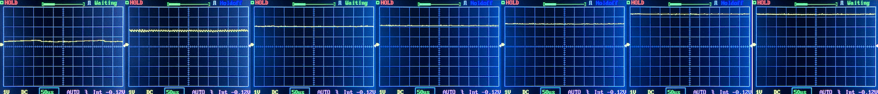 Then there’s the Ultrafire WF-602C flashlight, which has some of the worst PWM I’ve seen. It’s so bad that I used a post about it to explain PWM! Here are multiple timescales (10ms, 5ms, 2ms, 1ms, 0.5ms, 0.2ms) to make comparing this “worst” PWM light to the test light easier. That post also explains why I didn’t test the WF-602C at the usual 50us scale.