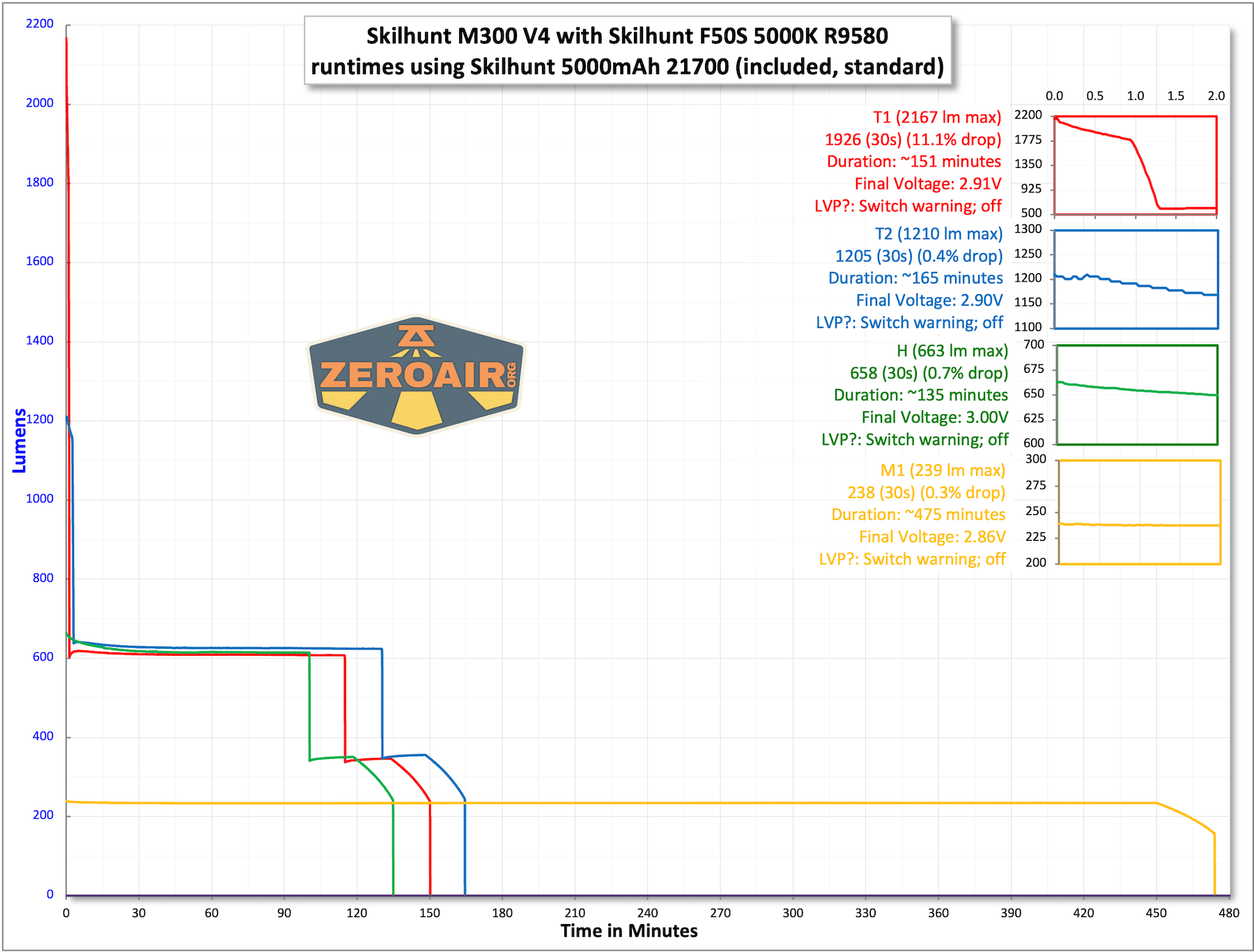 | Mode | Mode Claimed Output (lm) | Claimed Runtime | Measured Lumens | Tailcap Amps |