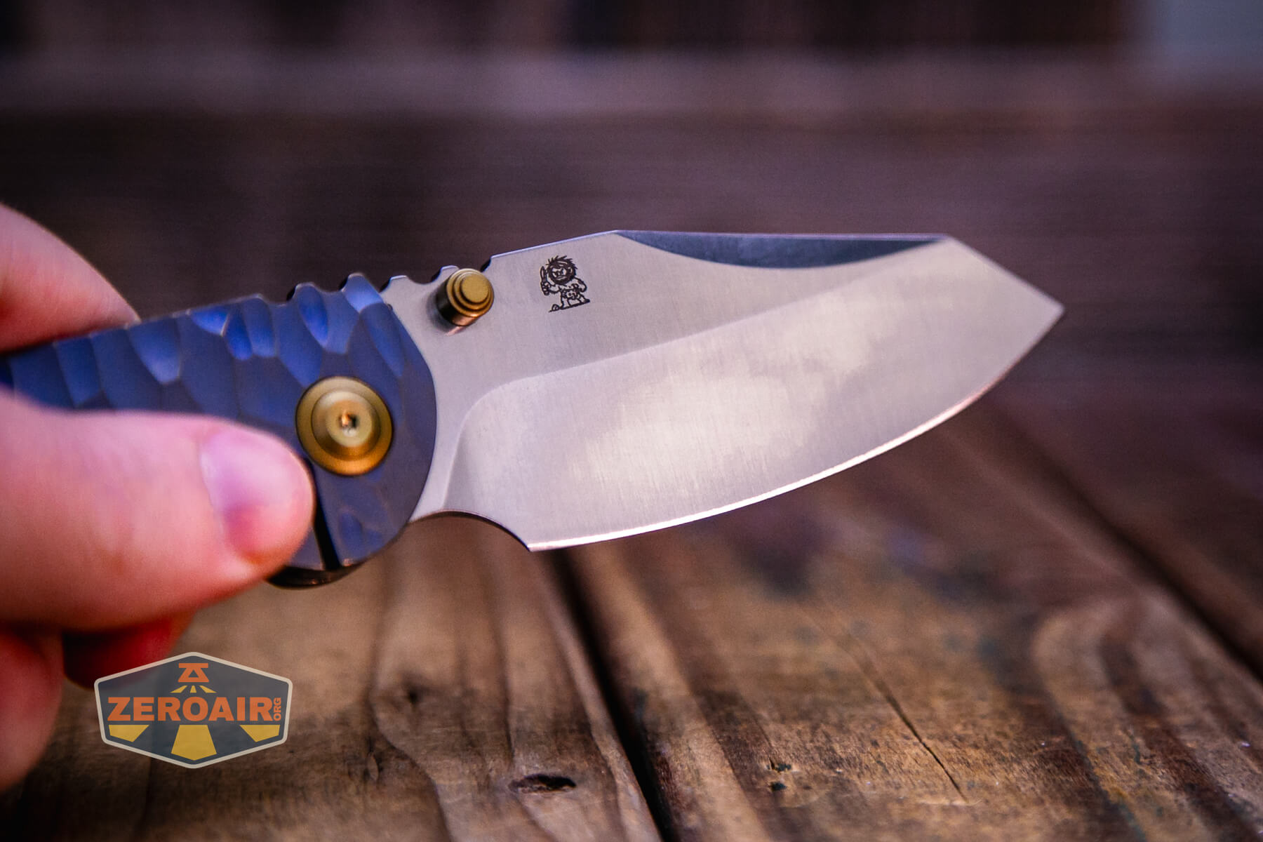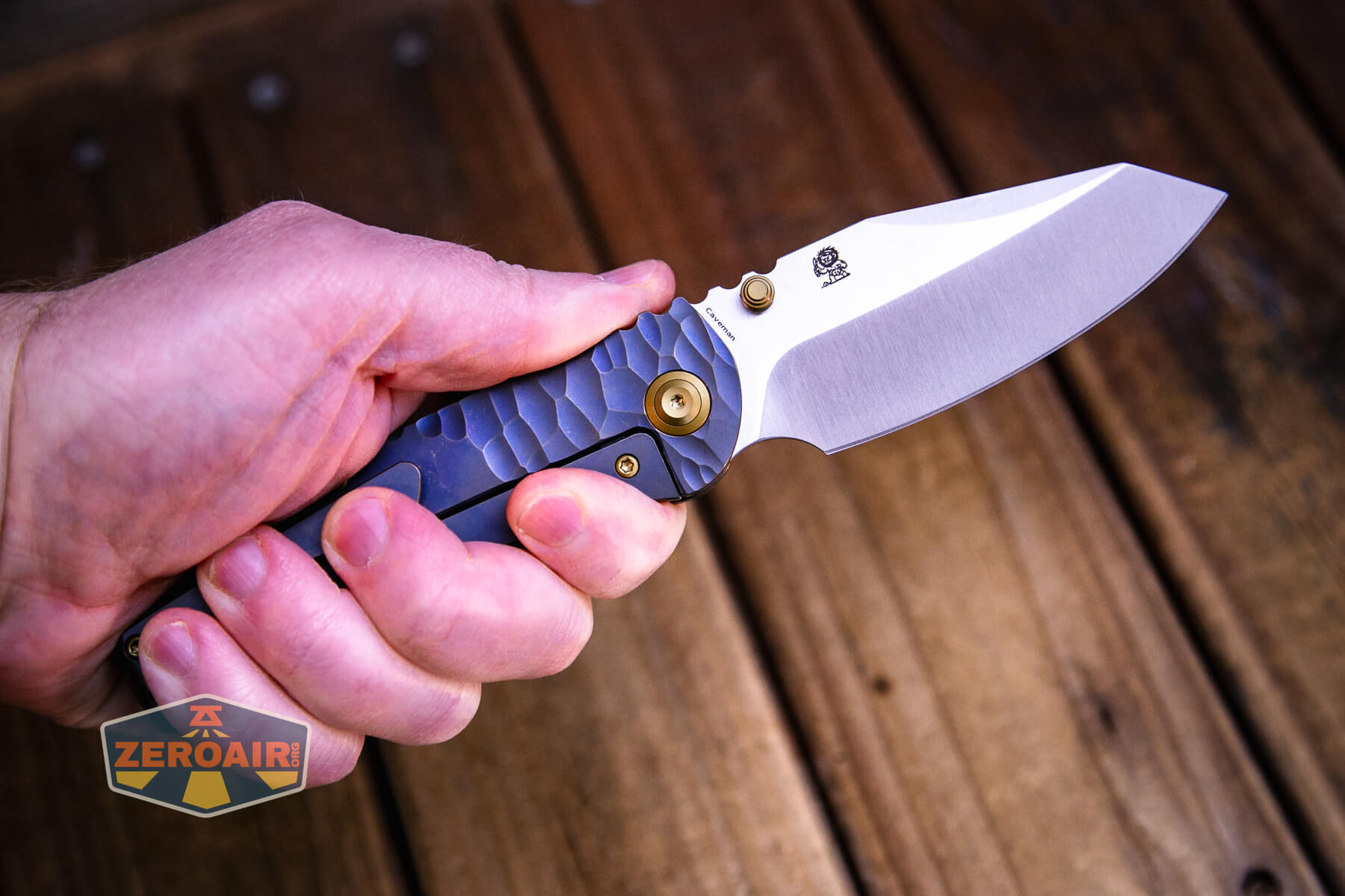 There are a ton of versions of the Kansept Caveman frame lock knife. This version is the “blue anodized and stonewashed titanium” version. But there appear to be (or have been at one time) at least eight other versions, some of which have very fancy appointments.