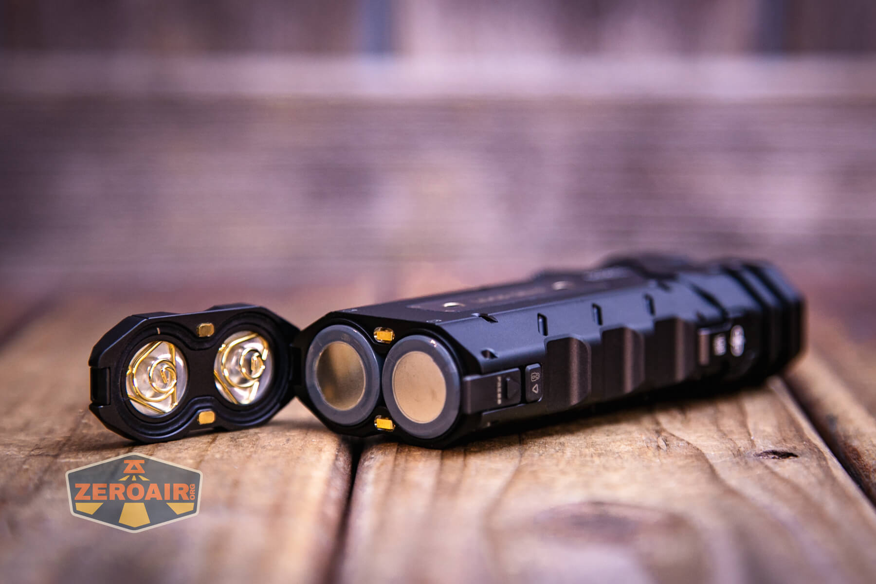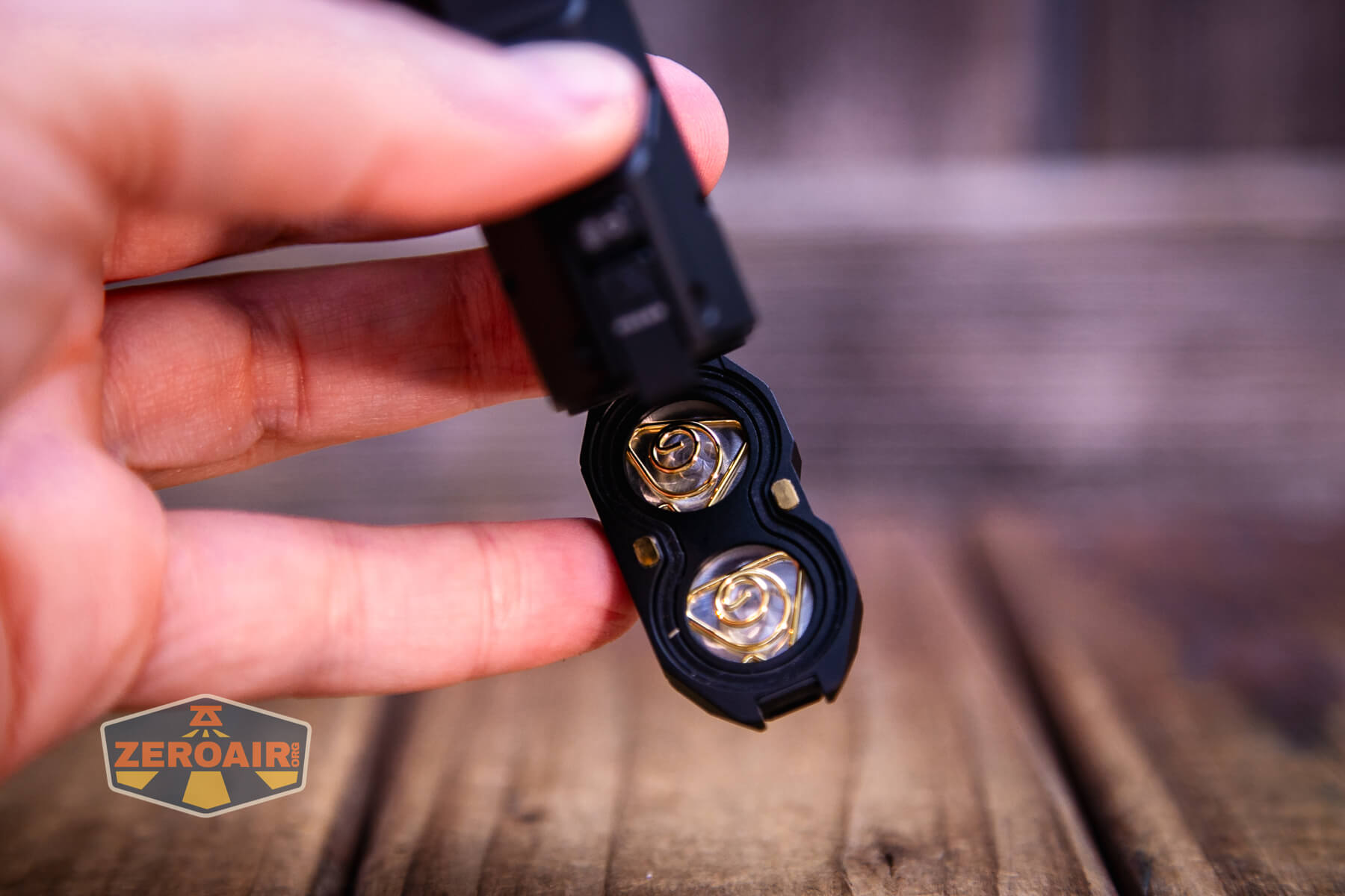 The previous Pro version had accessible cells, and the LoopGear SK-05 II Pro flashlight does as well. Inside the light, you can see that the positive contact for each cell is a big button.