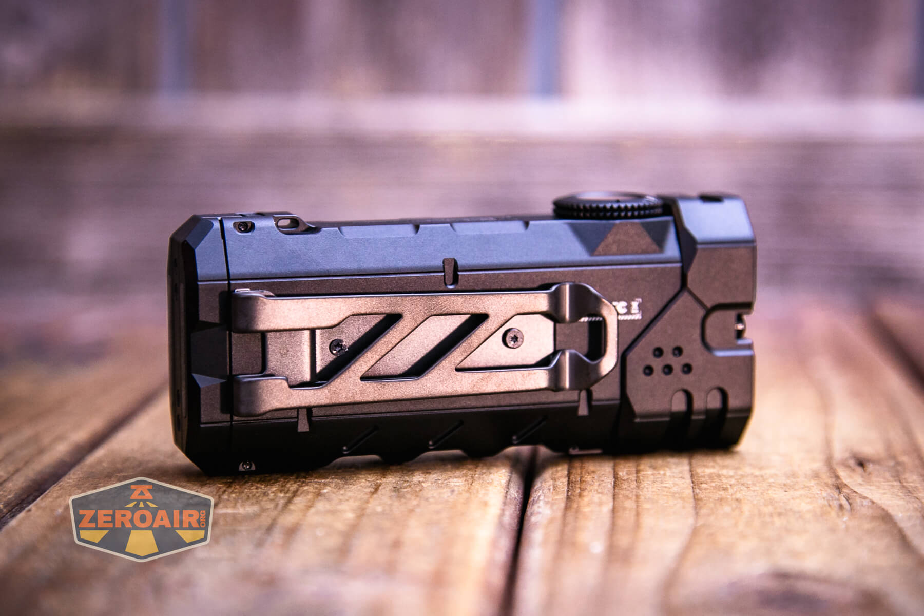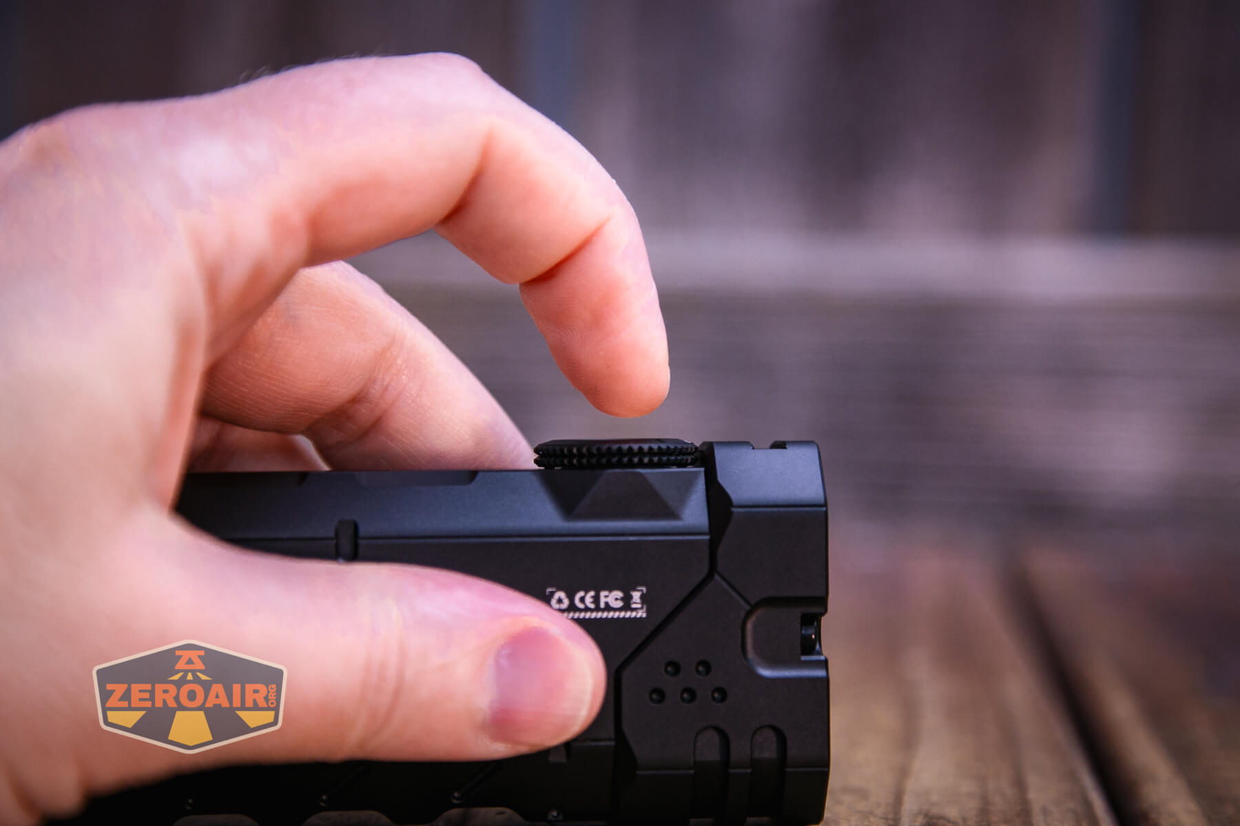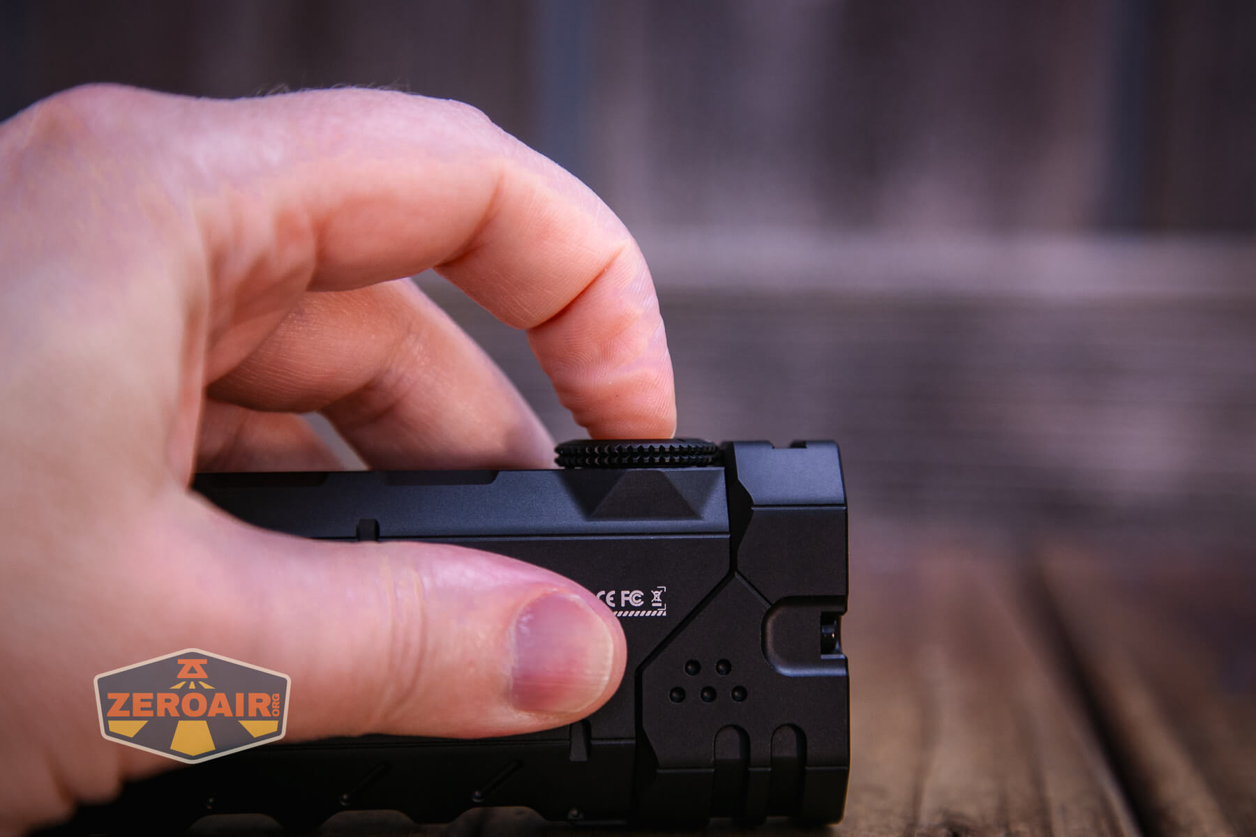 There are two ways to interact with the LoopGear SK-05 II Pro flashlight. First, there’s a rotary dial. It has four positions. Locked (seen below), flood, spot, and side RGB.