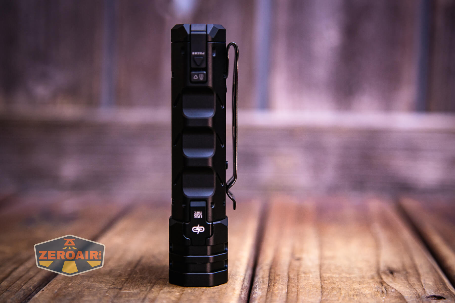 The light shuts off with low voltage protection. There’s a prominent side RGB COB that alerts the user to the approximate cell voltage at startup. In fact, you don’t even have to turn the light on – just switch the rotary dial away from lockout mode, and the indicator will display the charge level. It’s basically a power meter. Red means basically empty (“0%”), and anything blue is higher than that. So, for example, if the indicator is half blue and half off, the charge is approximately 50%.