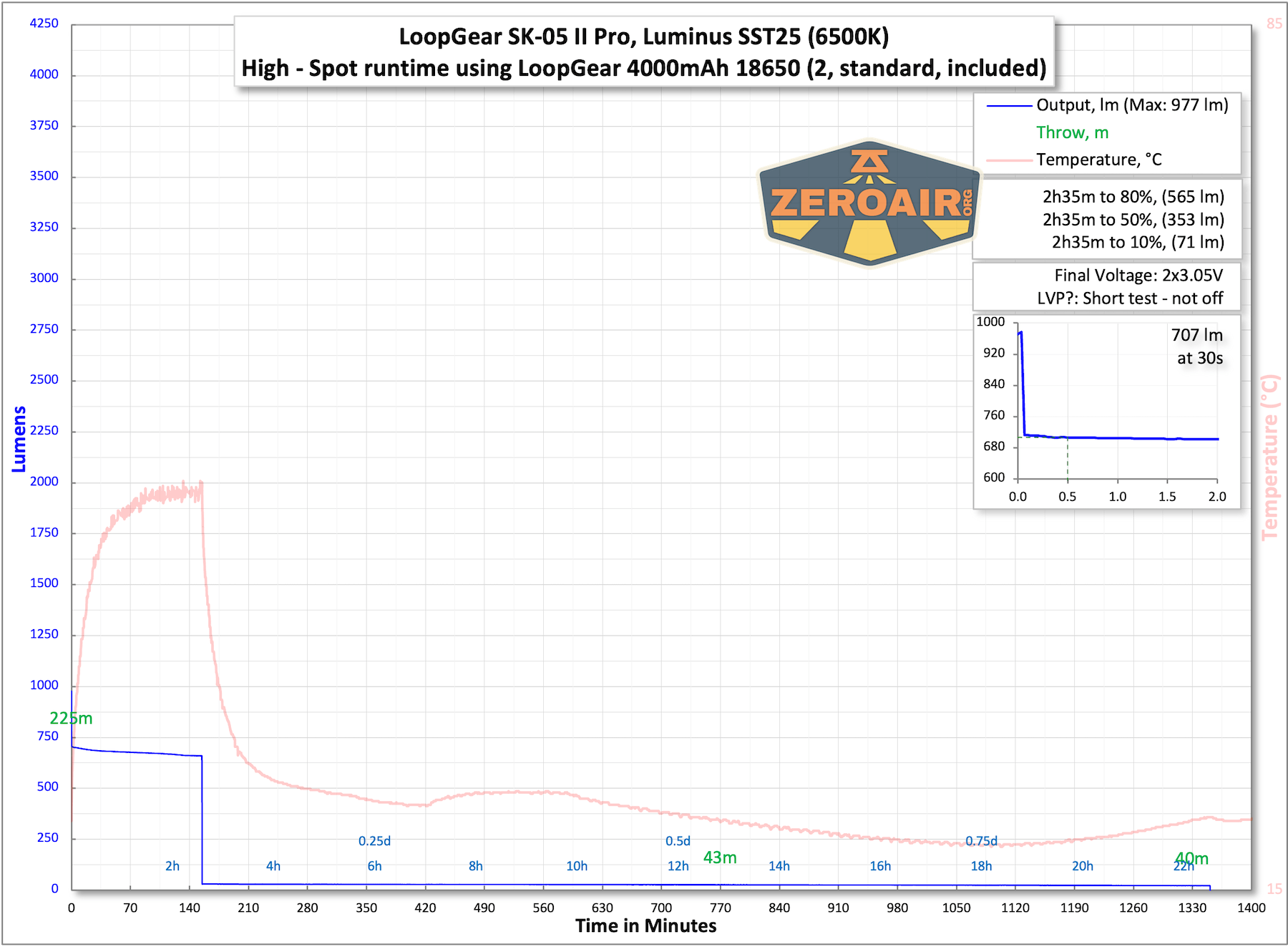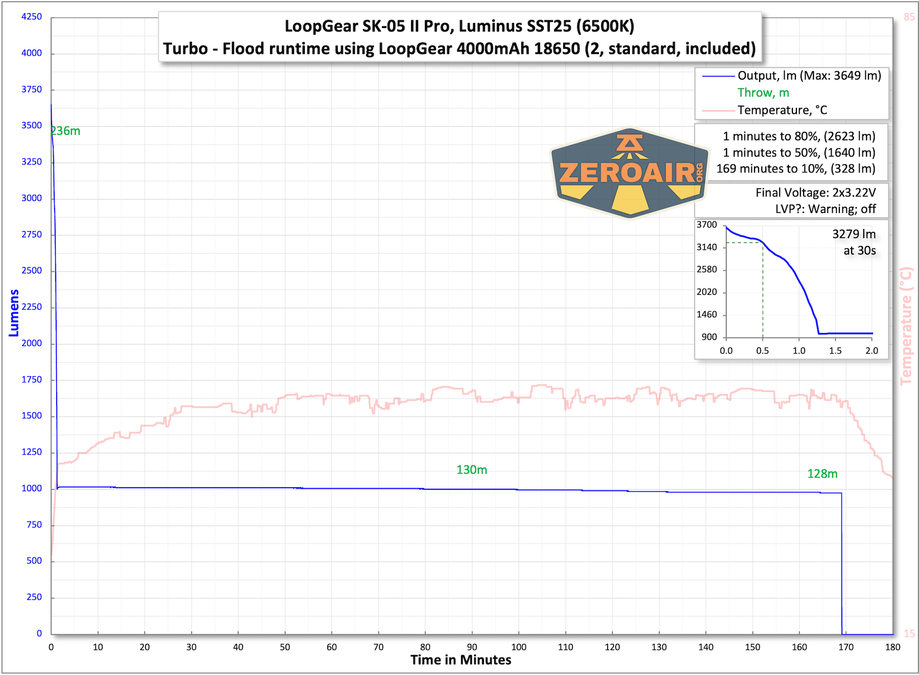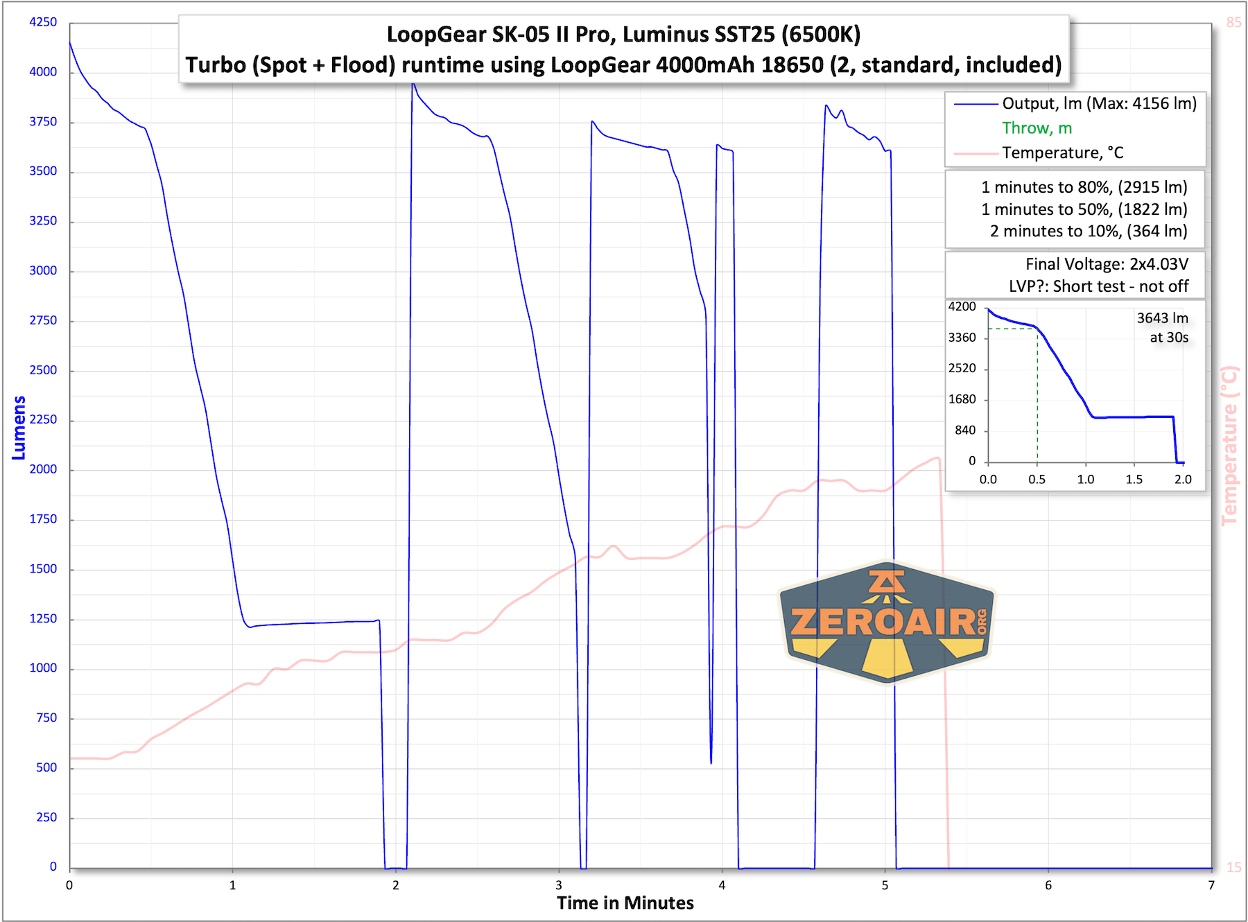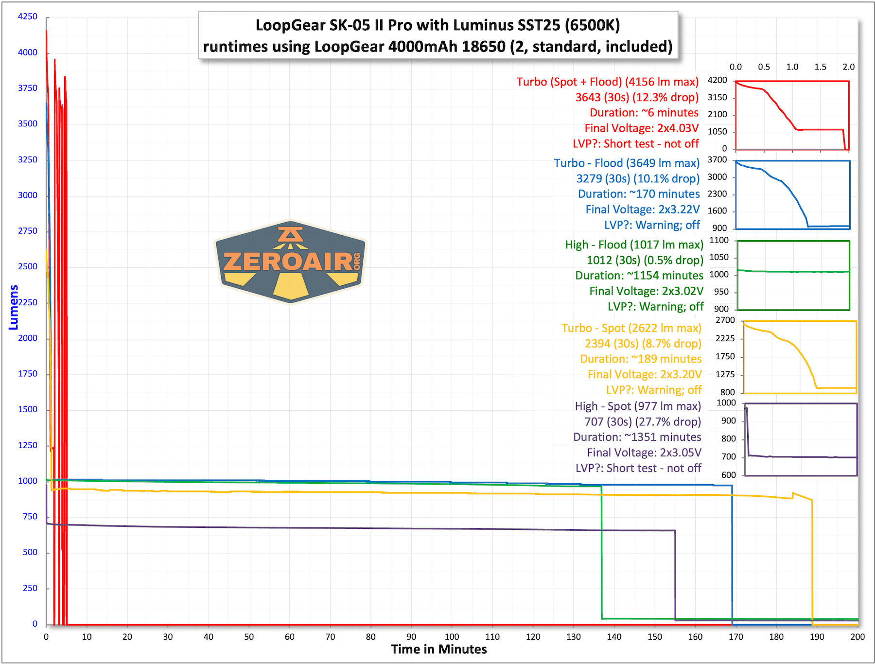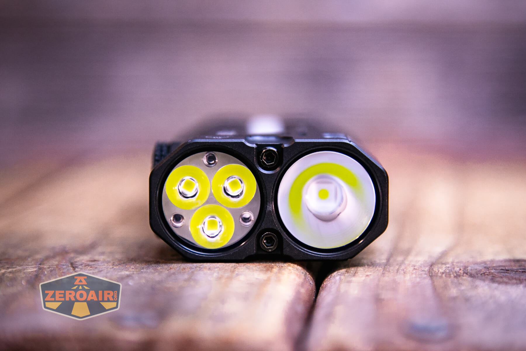 Runtime tests are below. I tested the higher two modes with both types of output (spot and flood). The light offers a brief “both emitters” option, but it is “momentary only.”