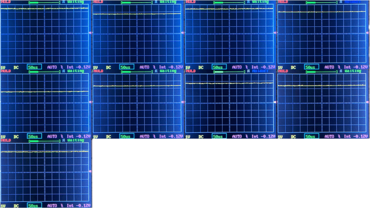 Then there’s the Ultrafire WF-602C flashlight, which has some of the worst PWM I’ve seen. It’s so bad that I used a post about it to explain PWM! Here are multiple timescales (10ms, 5ms, 2ms, 1ms, 0.5ms, 0.2ms) to make comparing this “worst” PWM light to the test light easier. That post also explains why I didn’t test the WF-602C at the usual 50us scale.