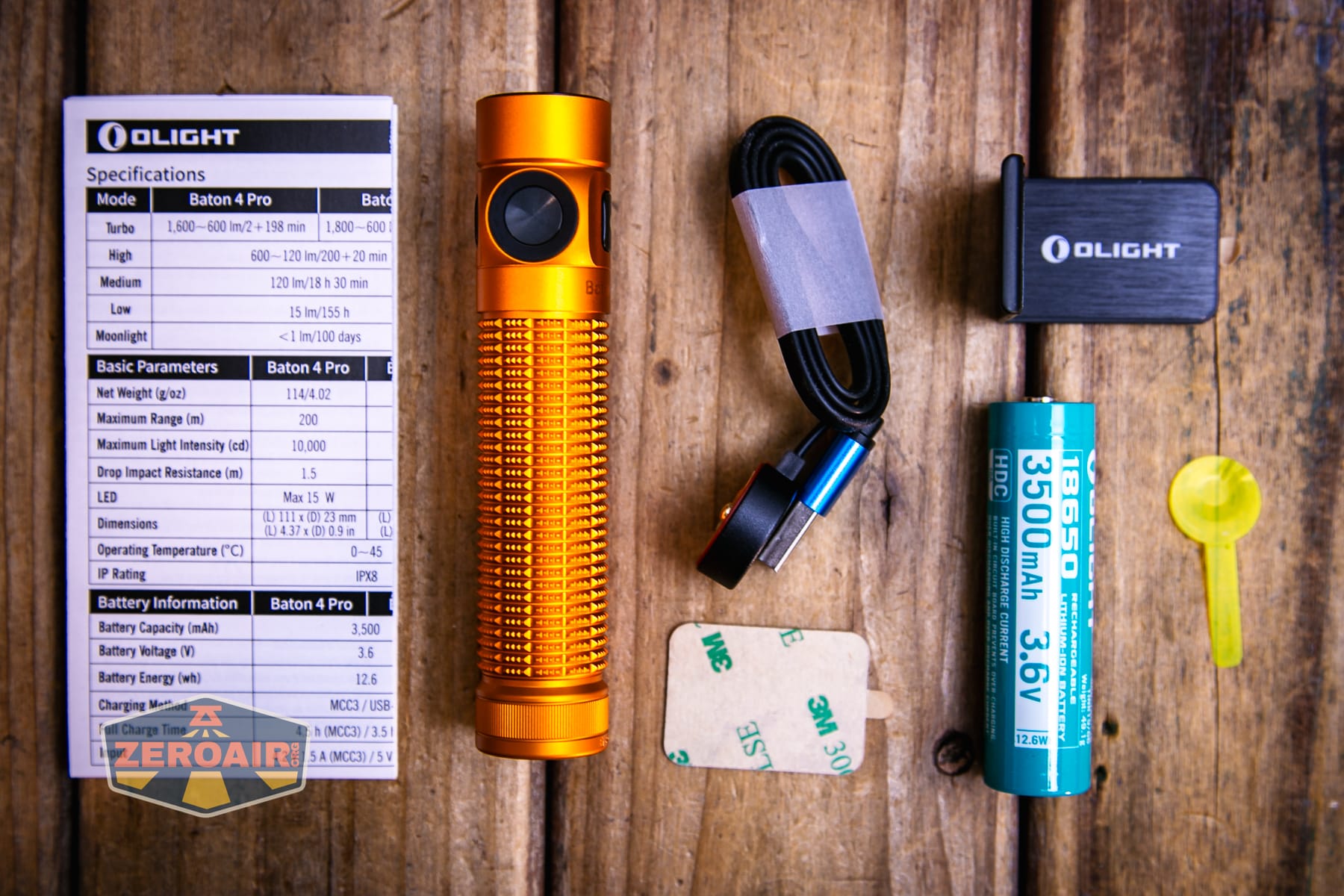 The Olight Baton 4 Pro flashlight is powered by a single lithium-ion cell. It’s a customized 18650 (included), with both positive and negative terminals on the positive end. A “normal” (or “non-customized”) 18650 will not work in this light.
