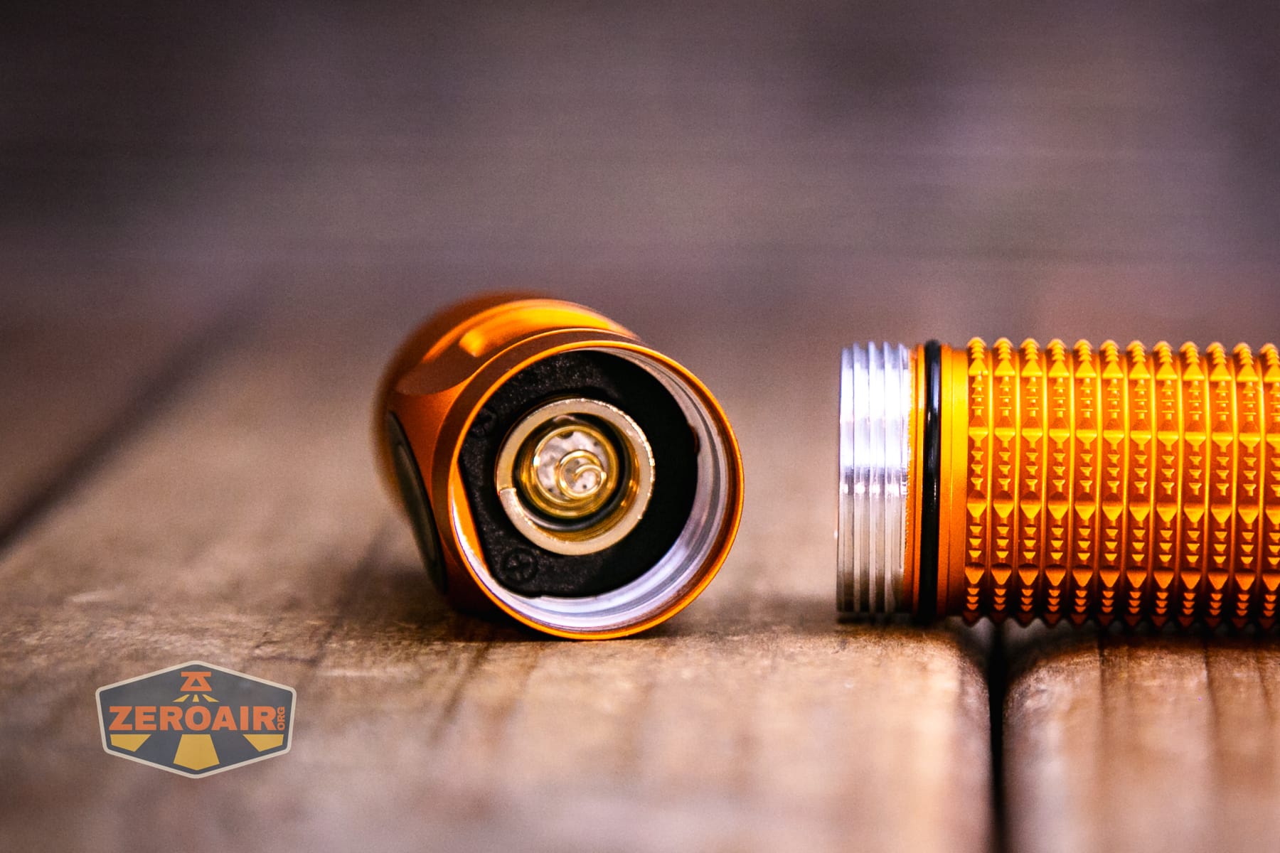 Inside, the Olight Baton 4 Pro flashlight is like those of recent generations. The head has a bunch of contacts so that it can run the proprietary customized 18650.