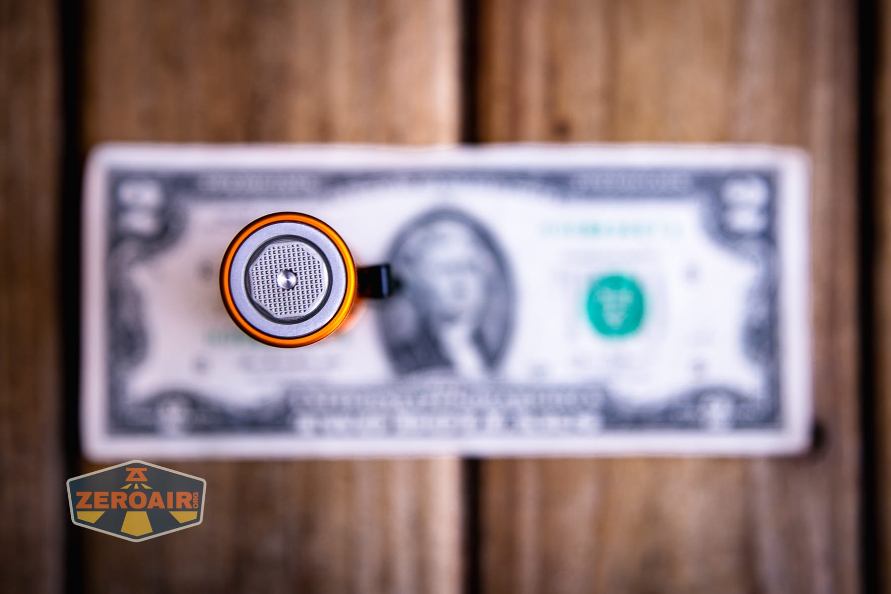 The switch area has a couple of indicators, too. These indicators aren’t technically on the switch, but in the surrounding bit of black plastic. Above, the top indicates the output level. The bottom indicates the battery level.