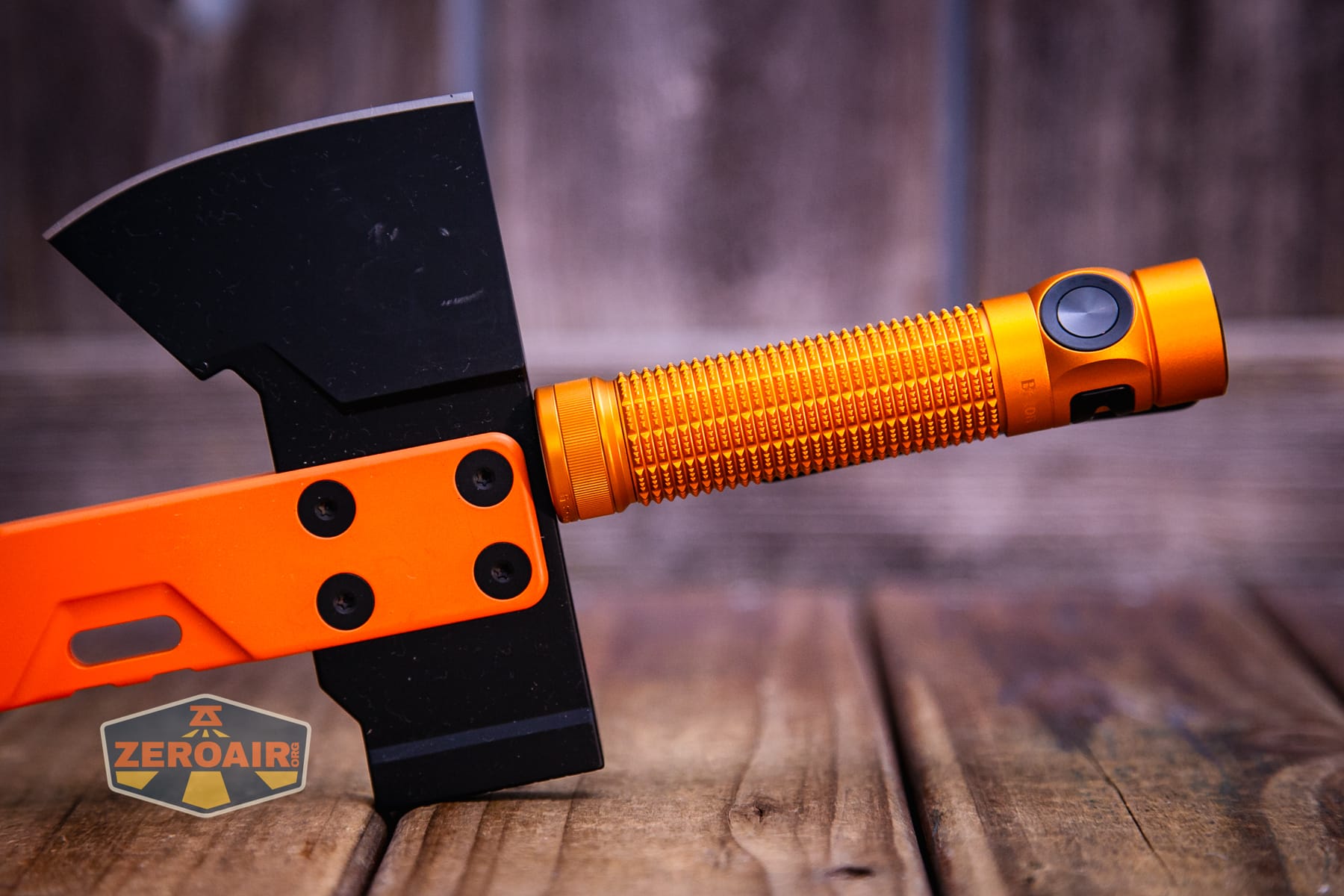 Above, you may note a new holder for my magnetic-tailcap items. That’s the Exceed Designs Hyzer Titanium Mini Hatchet D2 axe. The handle (as the name suggests) is titanium. But the blade is D2 steel and perfect for retaining magnetic tailcap flashlights! The Hyzer is available in a bunch of cerakote body colors as well as different thickness D2 heads.