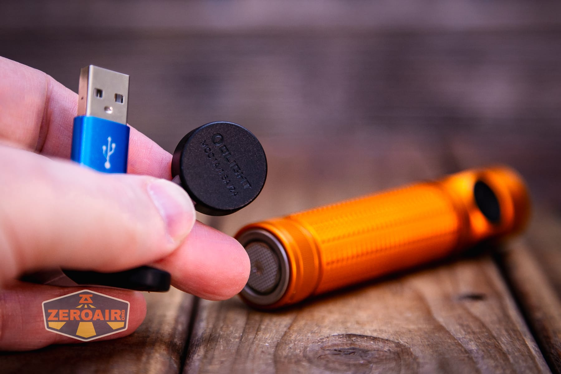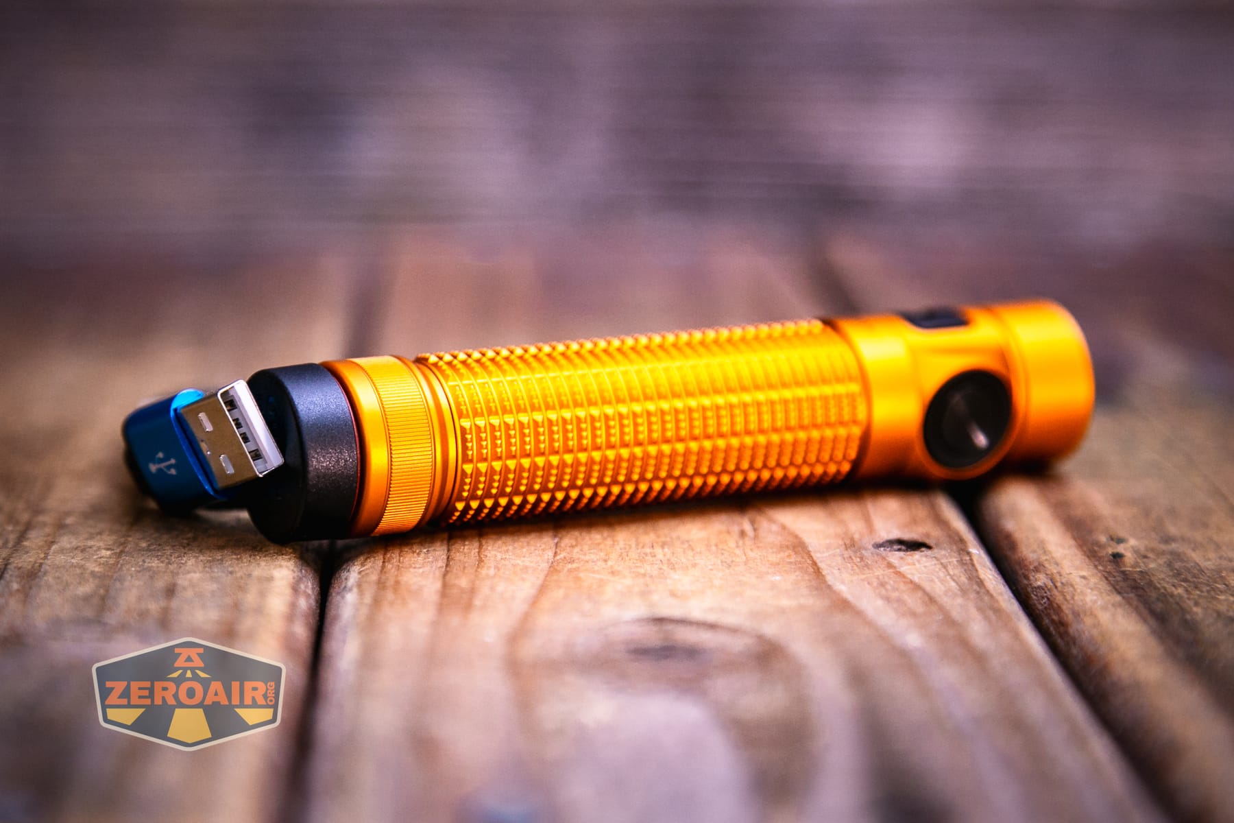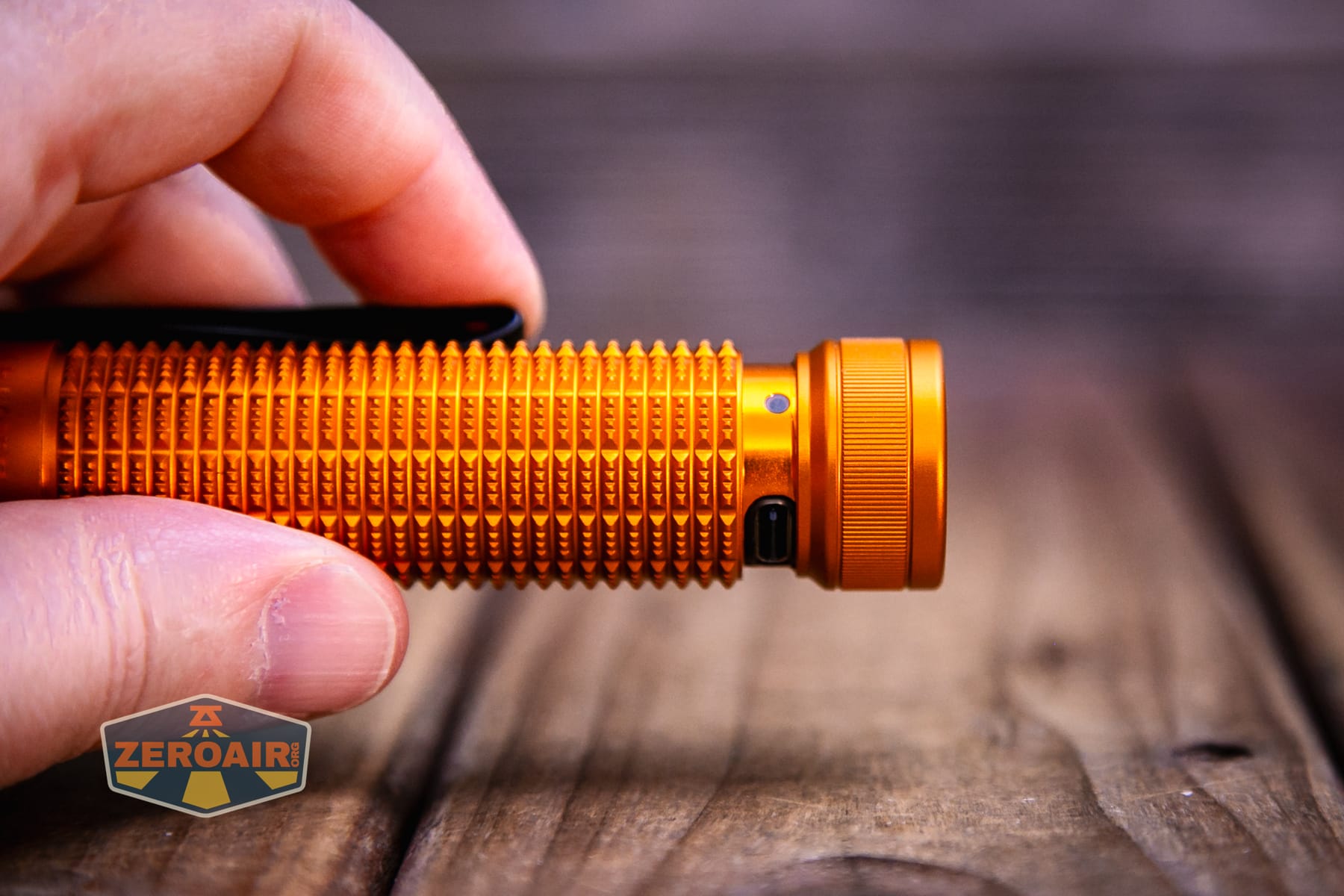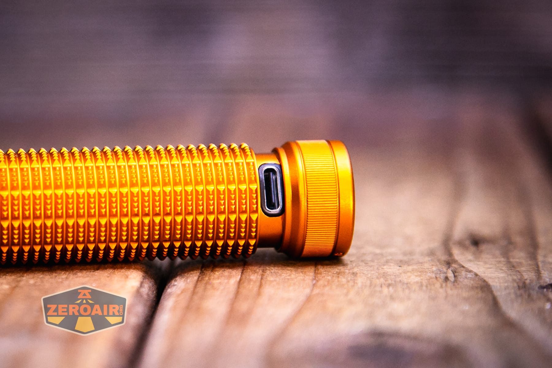 A massive update to the Baton line is that this Olight Baton 4 Pro flashlight features USB-C charging! To access the charging port, unscrew the tailcap. The USB-C port is revealed, as below.