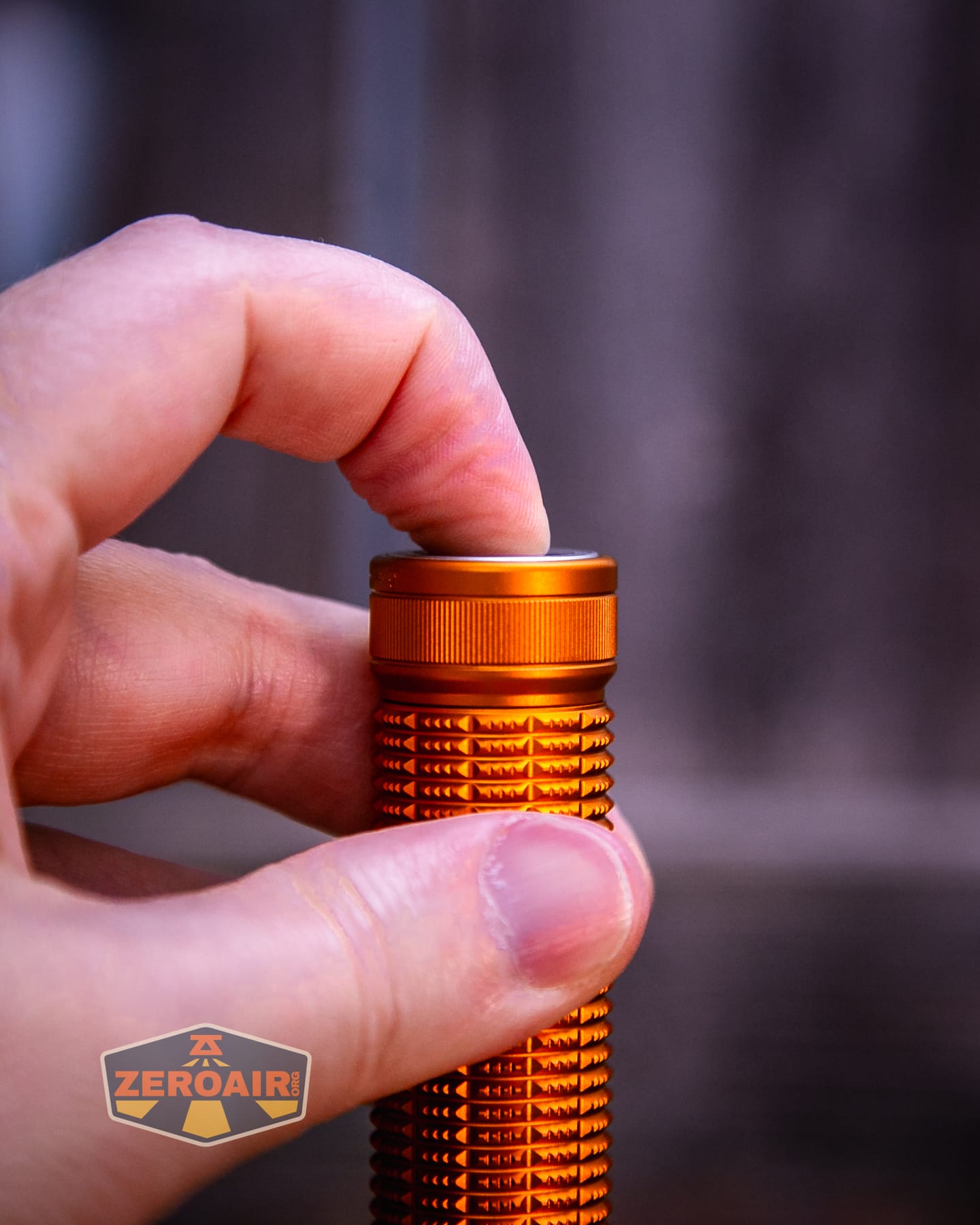 This switch is a bit more flush than the slight dome of previous (non-metal) switches. I like it! If you place the light “switch-down” (clip-up, ayy), the switch can not be pressed by mashing the light against a table. (I.e., it doesn’t protrude that much or that way.)