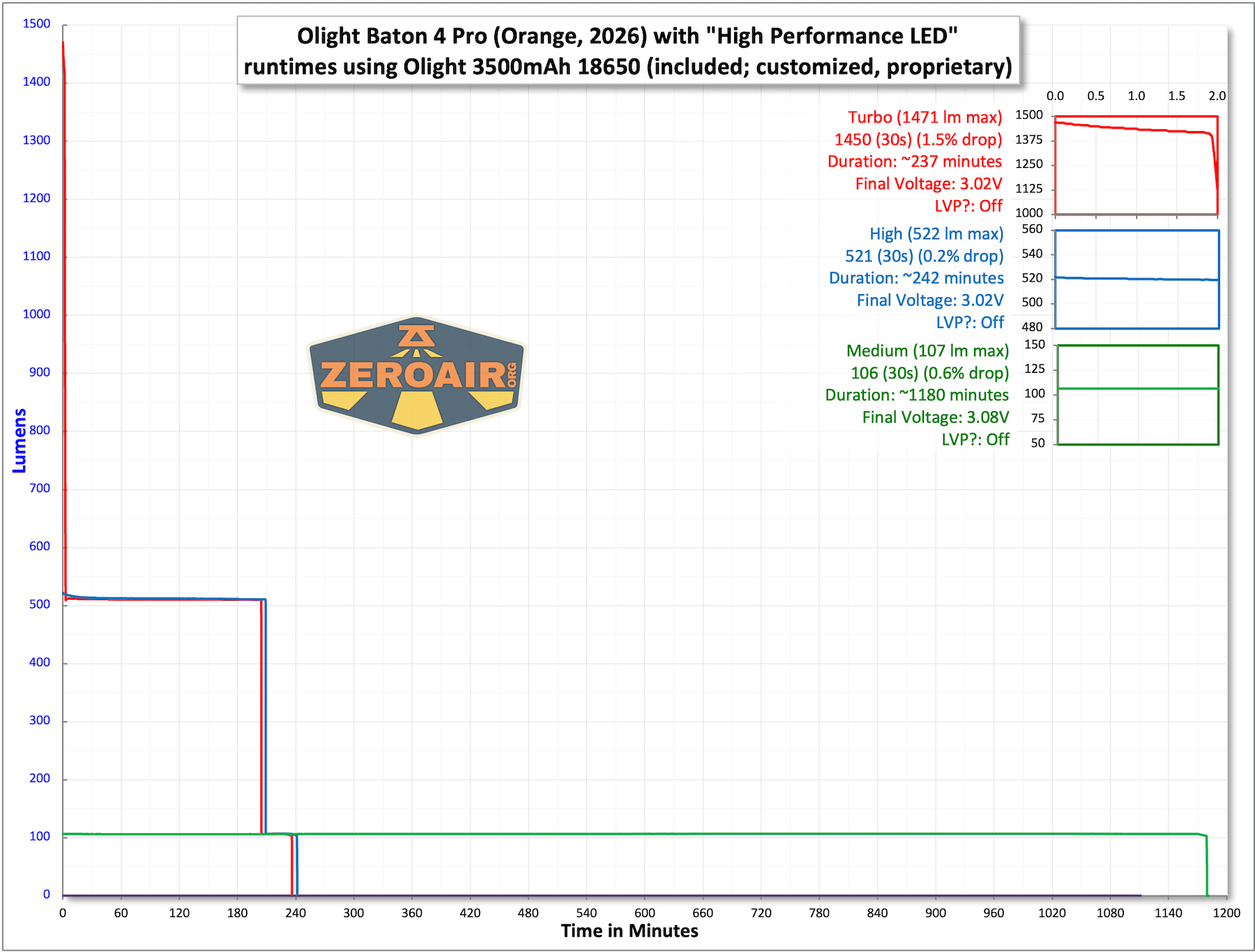 | Mode | Mode Claimed Output (lm) | Claimed Runtime | Measured Lumens | Tailcap Amps |
