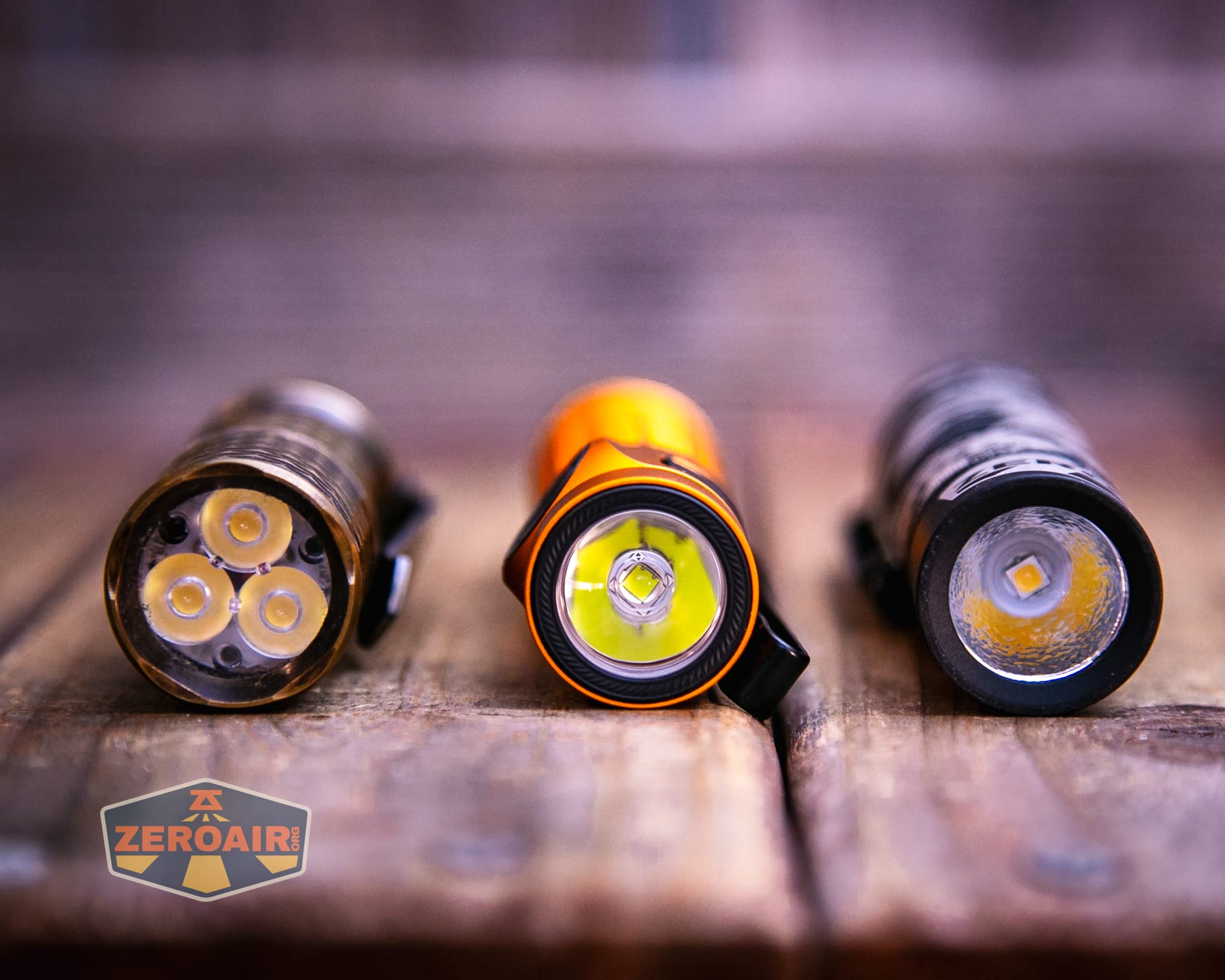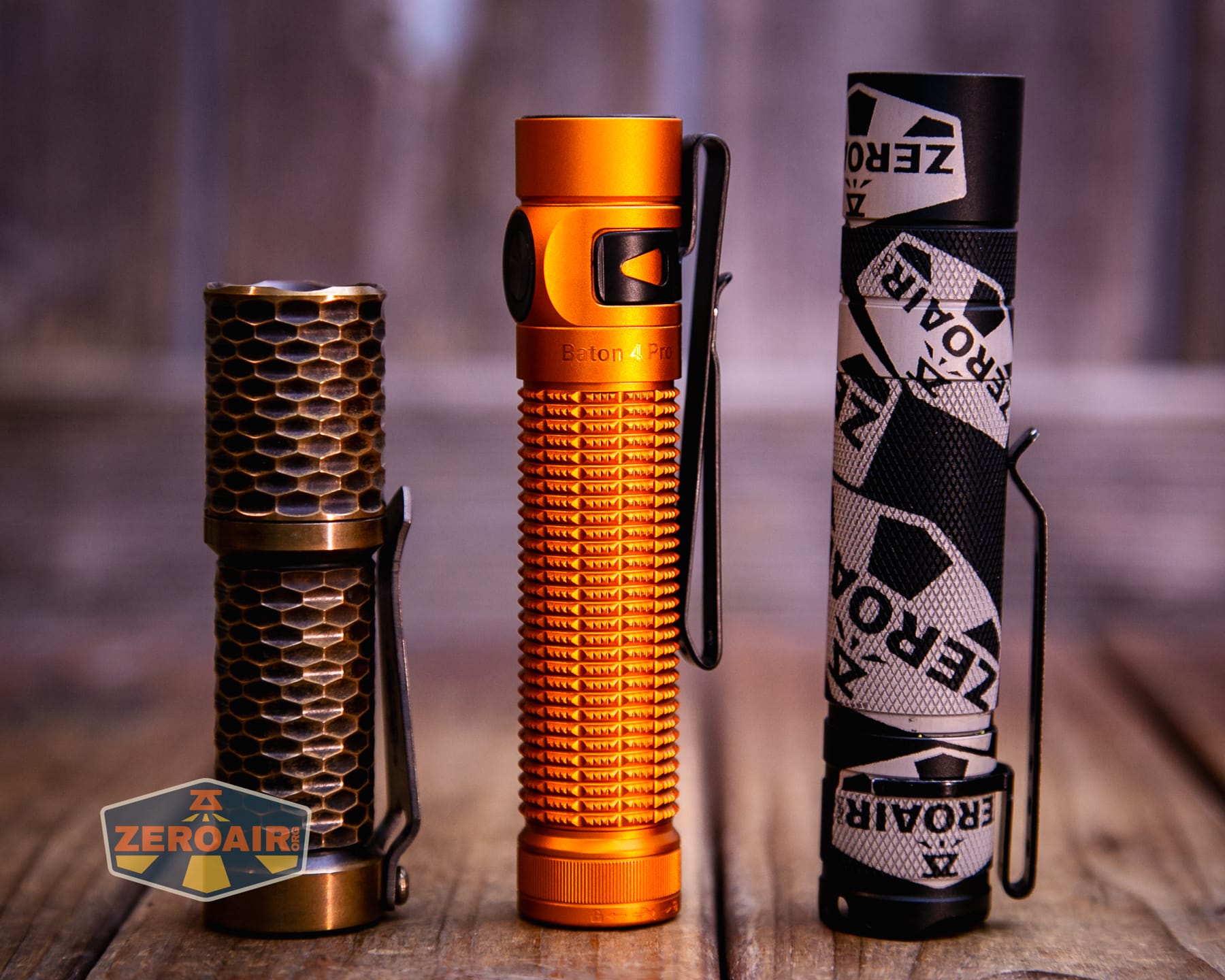 Also in the photo above, my Standard Reference Material (SRM) flashlight is the Hanko Machine Works Trident, an 18350 light. While I have not reviewed or tested the Gunner Grip version seen here, I have tested a Hanko Machine Works Trident Total Tesseract in brass. I love the Trident, and it’s a striking contrast to the inexpensive Convoy S2+, another great SRM.