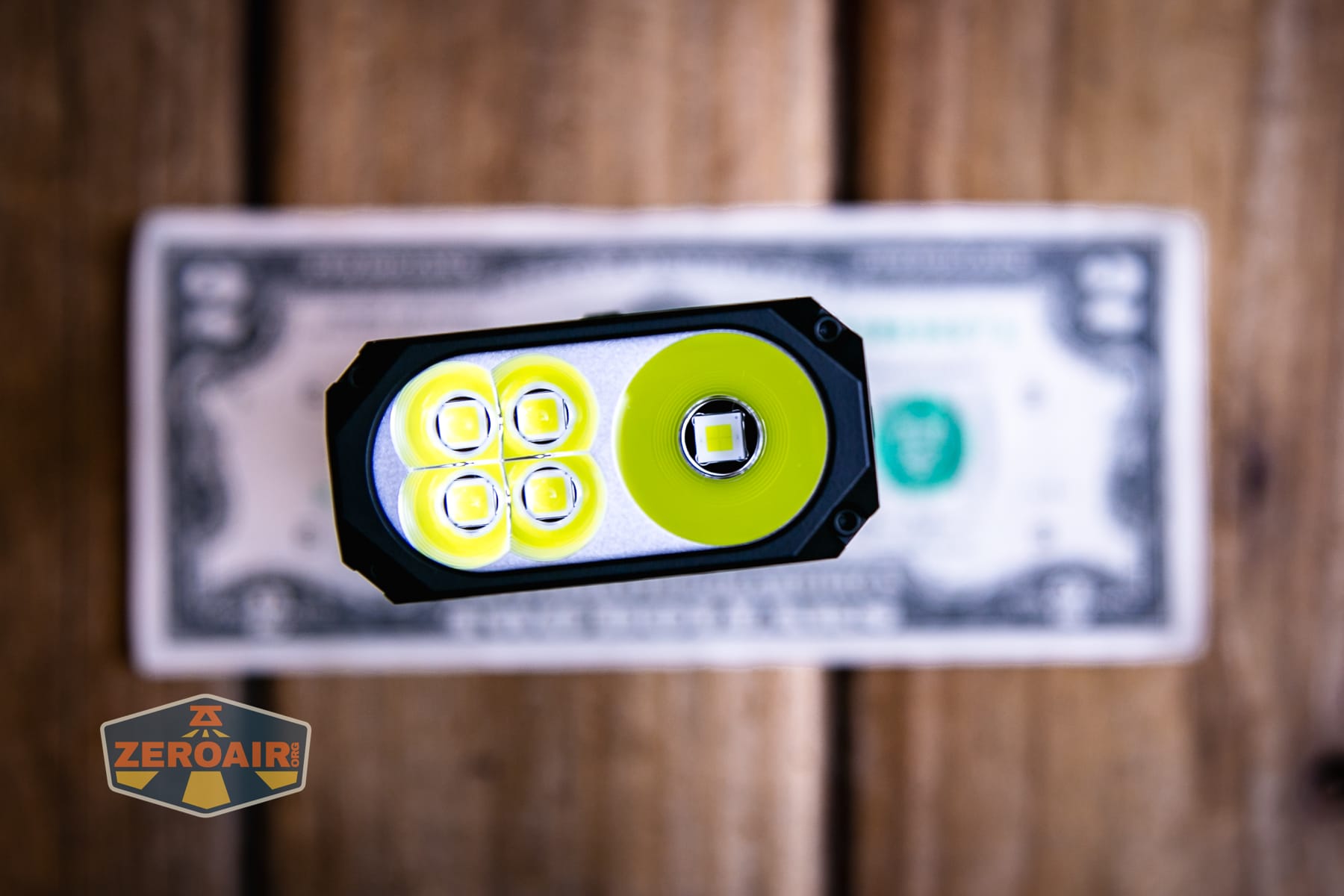 The Wuben X1 Pro 2 flashlight uses five Cree XHP50.3 emitters. The four flood emitters are of the HD variety (domed), and the spot emitter is a HI (high intensity – no dome). They each have a reflector.