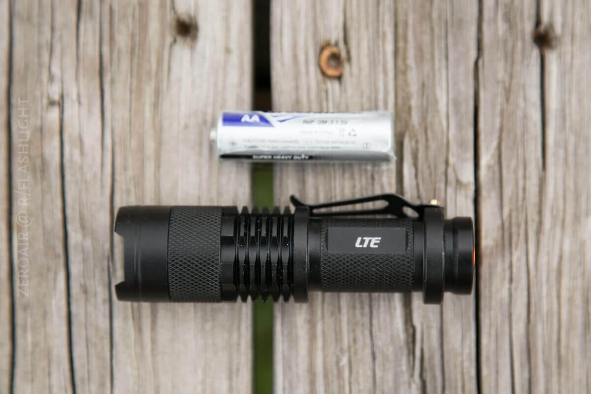 The LTE Tactical Lighting Zoomy is a recognizable design. There’s a tail mechanical clicky, and the light runs on both AA and 14500 cells.