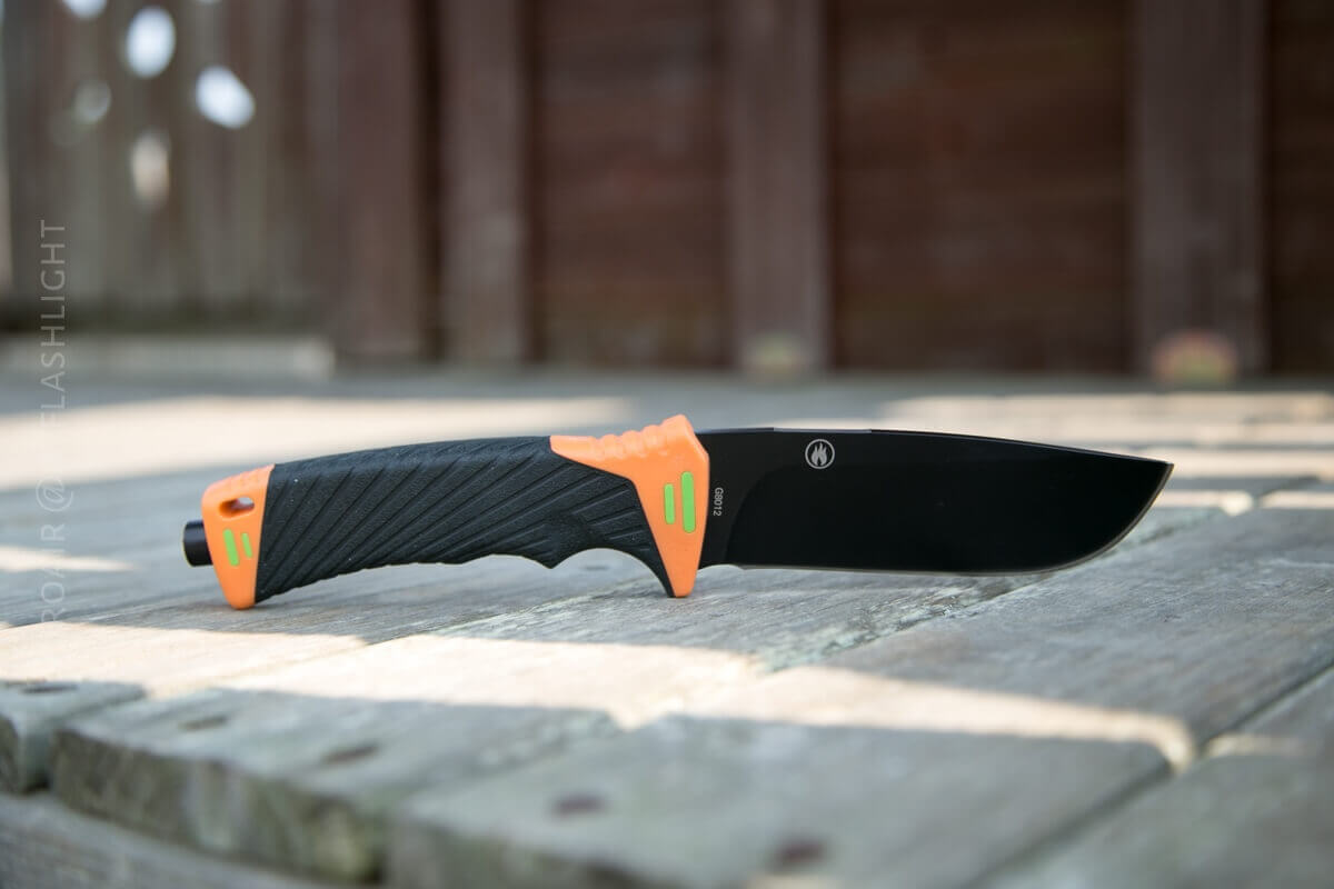 The Ganzo G8012-OR is a fixed blade “survival” knife. This is a knife with a beefy blade and has orange that accents the black DLC blade.